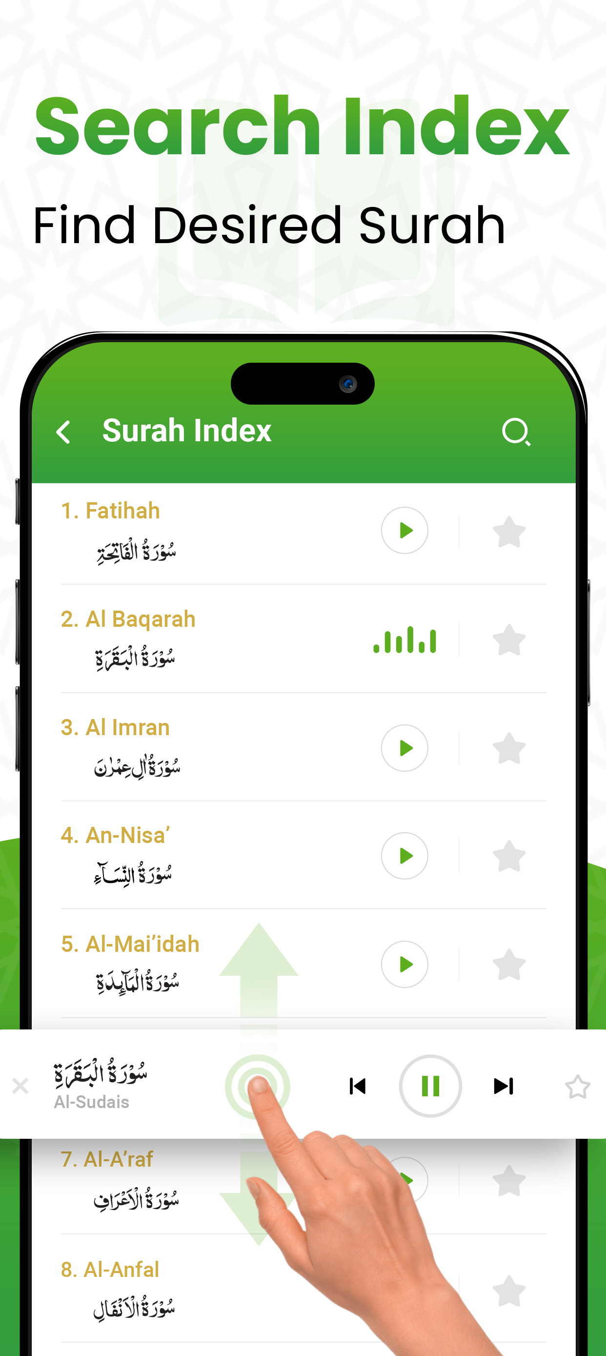 Tilawate Qur'an Majeed is more convenient and direct Surah reaching when you find desired surah from Al-Quran surah index for direct opening.