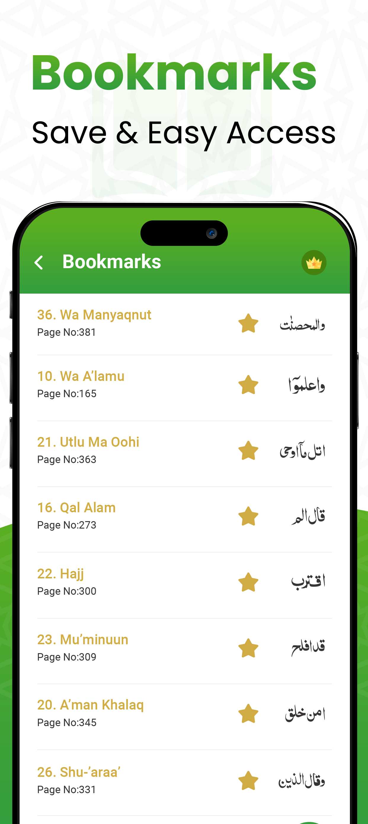 The abrupt interruption can let you forget the previous reciting page so before leaving use bookmarks option of 16 line offline Holy Qoran for the continuity of tilawate Koran Pak from the exact point.